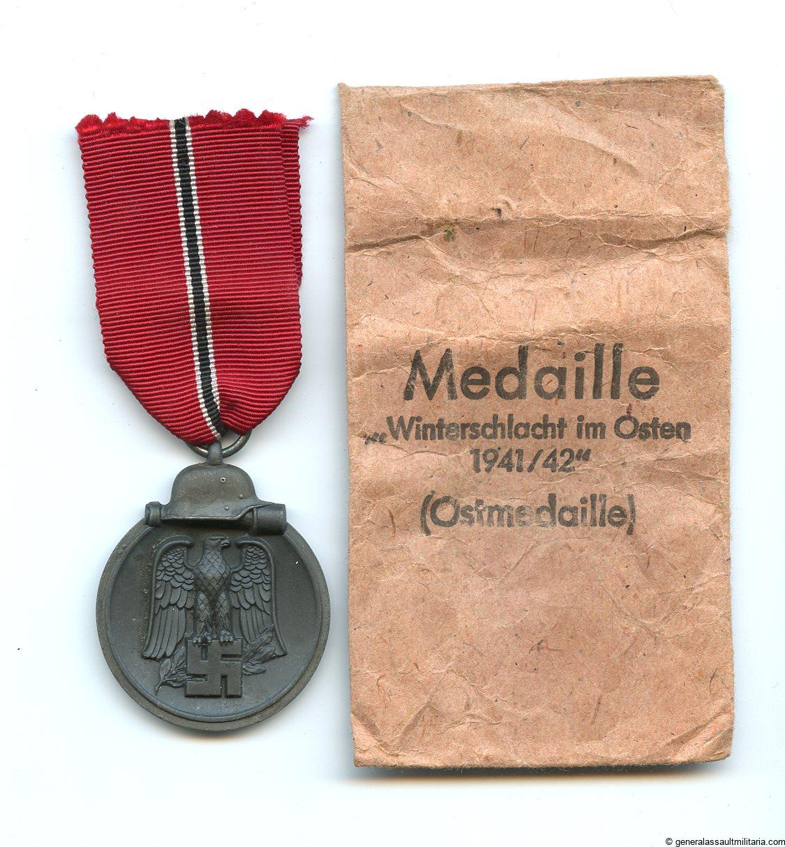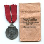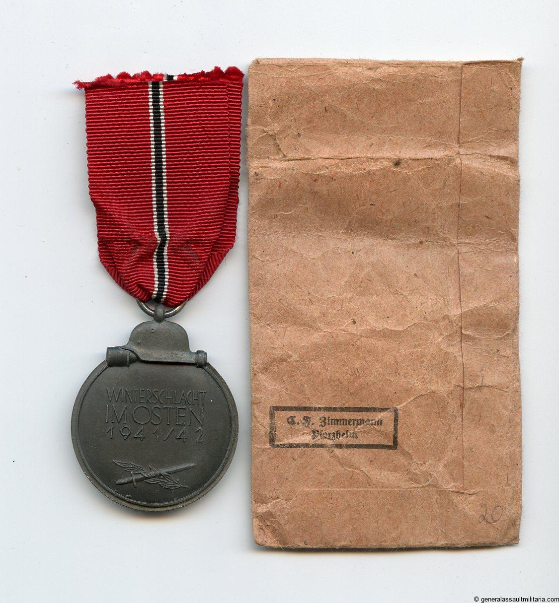 Winterschlacht im Osten medal + pouch – C. F. Zimmermann, Pforzheim. Sharp looking Ost medal without damage and slightly faded rim and helmet. Pouch remains in very good condition with just a couple fold lines. The medal is nicely marked 20 for Zimmermann.