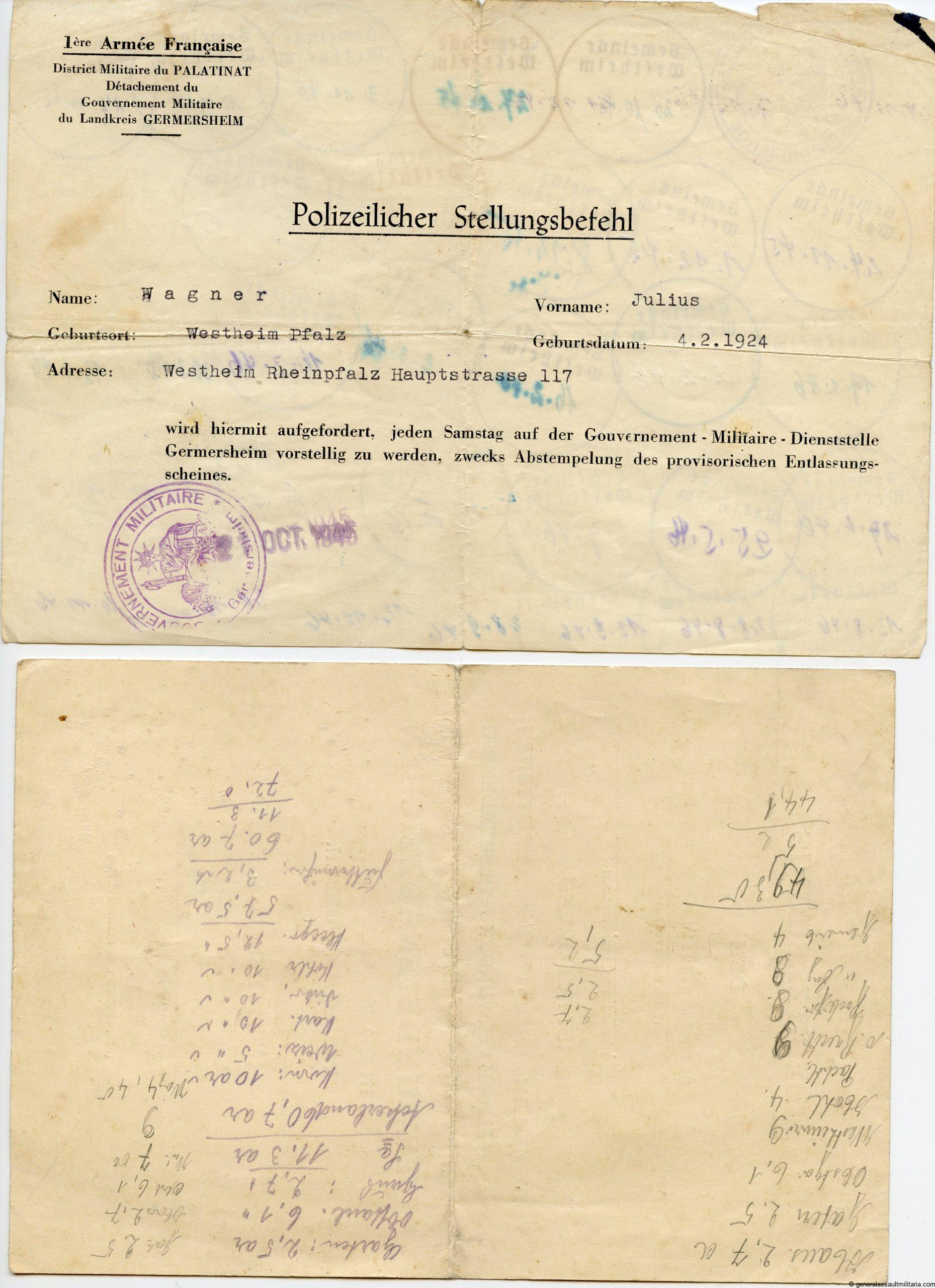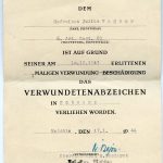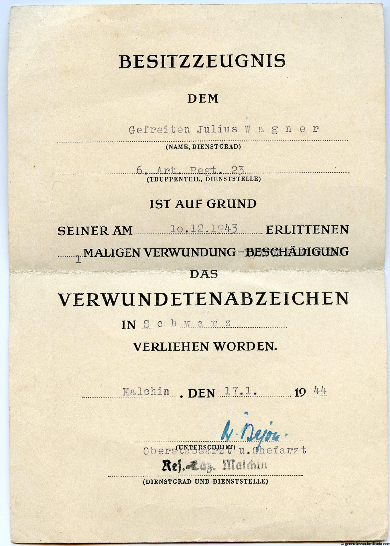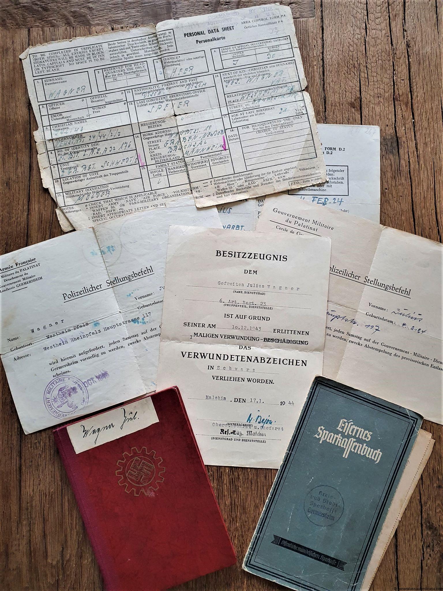 Small Wound badge in black estate Gefreiten Julius Wagner 6.Art. Regt. 23. Concists of the Wagner his Wound badge in black document dated 17.1.1944, 2x police order to show up for inspection every week with the back of these documents full with stamps of confirmation stamps.