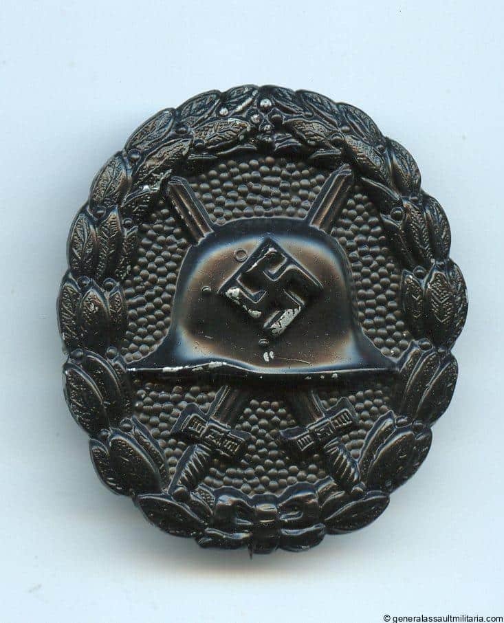 Wound badge in black 1st pat. – Otto Schickle, Pforzheim. Early war hollow zinc construction with semi-gloss black finish, Schickle design and setup. Remains in unworn or very lightly worn condition with minimal lose of the fragile finish(doesn`t hold well on zinc). Sought after variant with a great look and finish.
