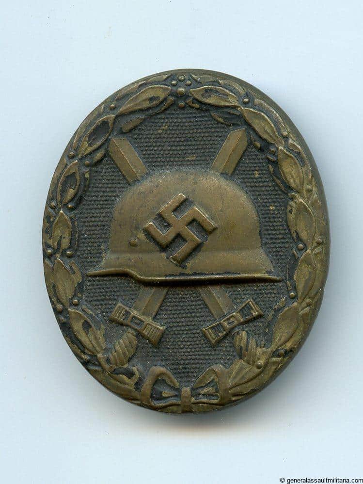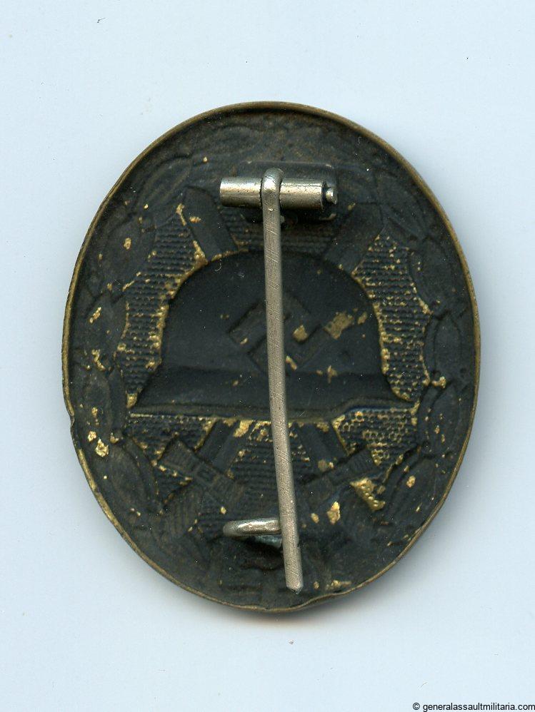wound badge in black – Deschler & Sohn, München. Early tombac wound badge with Übergrosse Deschler/Wiedmann design. Remains in well worn condition with nearly all the black paint worn down on the front and setup. Sought after version that can be encountered with a variety of setups.