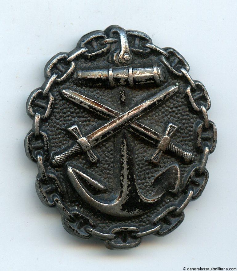 Wound badge in black Marine. Imperial Kriegsmarine design wound badge made from steel with semi gloss black lacquer finish. Remains in lightly worn condition with nearly all of the black finish remaining. Good looking example with some good wear to it.