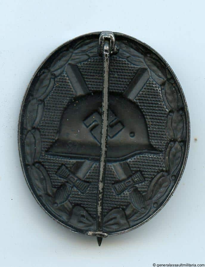 Wound badge in black – MM81 Werner Redo, Saarlautern. Mid to late war steel wound badge with semi gloss black finish. Remains in lightly worn condition with some wear and most of the paint still present. Maker marked with the PkZ 81 mark in the helmet and has the integral setup.