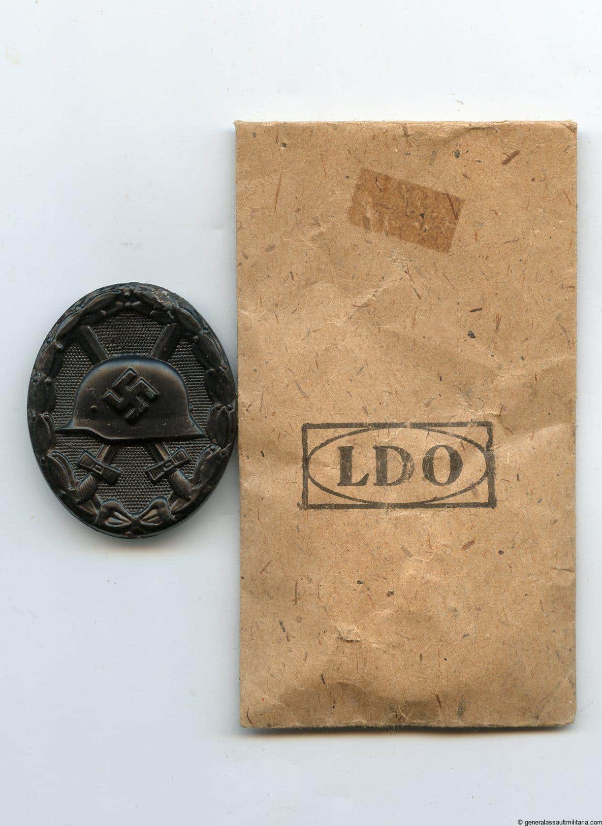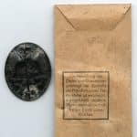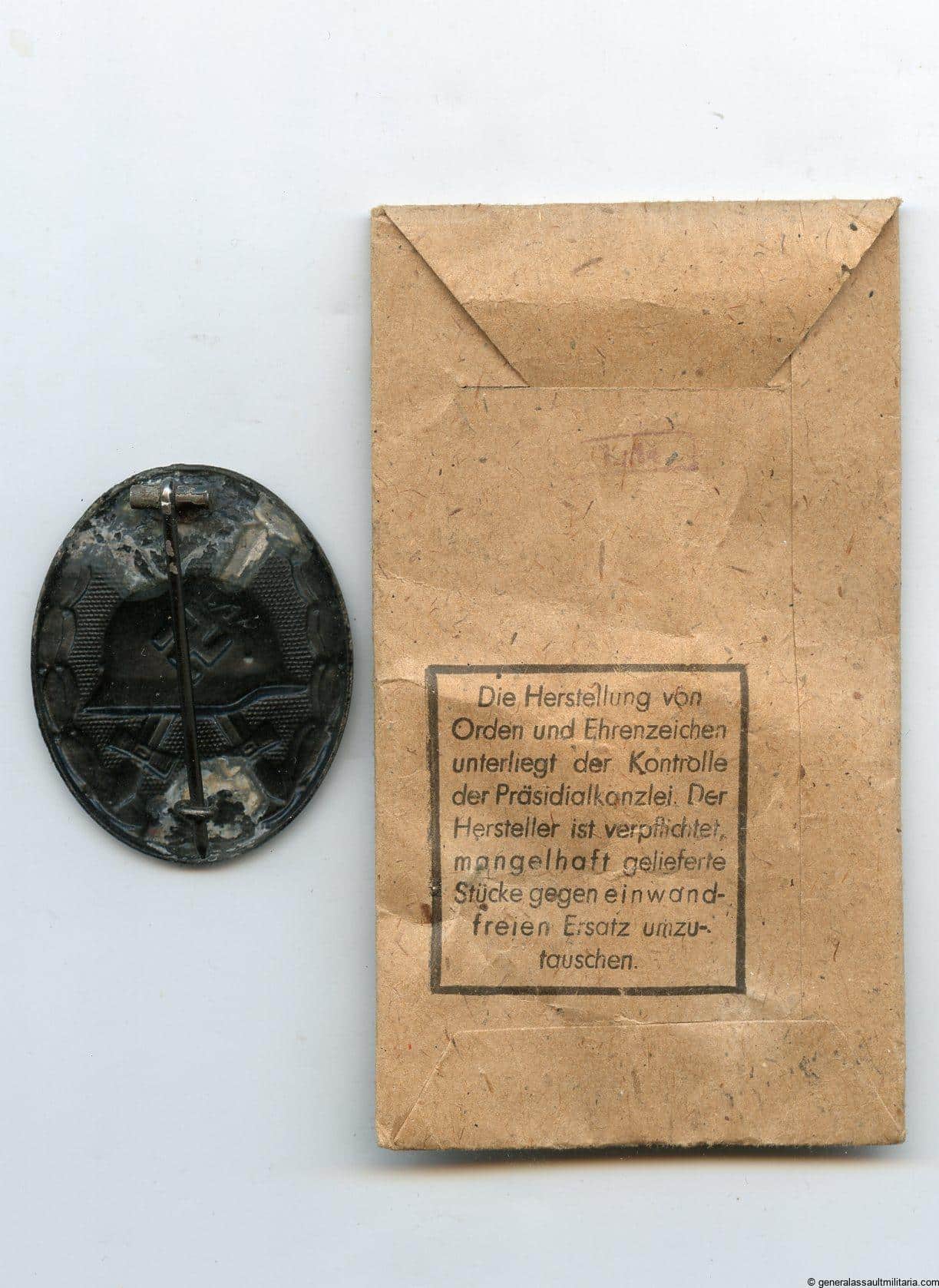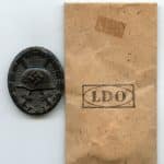 Wound badge in black + packet – Friedrich Orth, Wien. Steel construction wound badge with semi-gloss black lacquer and L/14 mark both on the packet and back of the vwa. Remains in unworn condition with some oxidation around the setup from storage. Most paint present on the front, with exception of the swastika. More uncommon version with matching L/14 marked packet in very good condition.