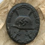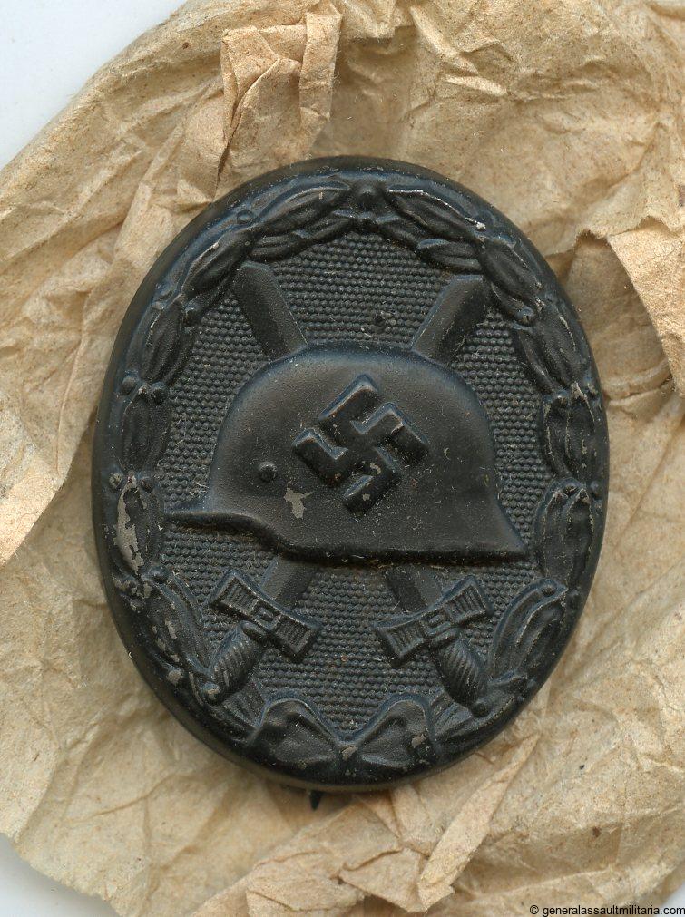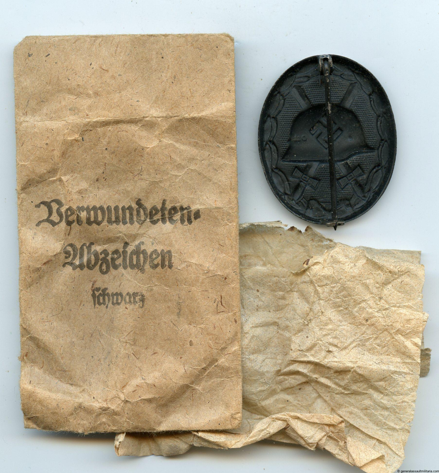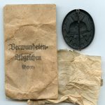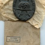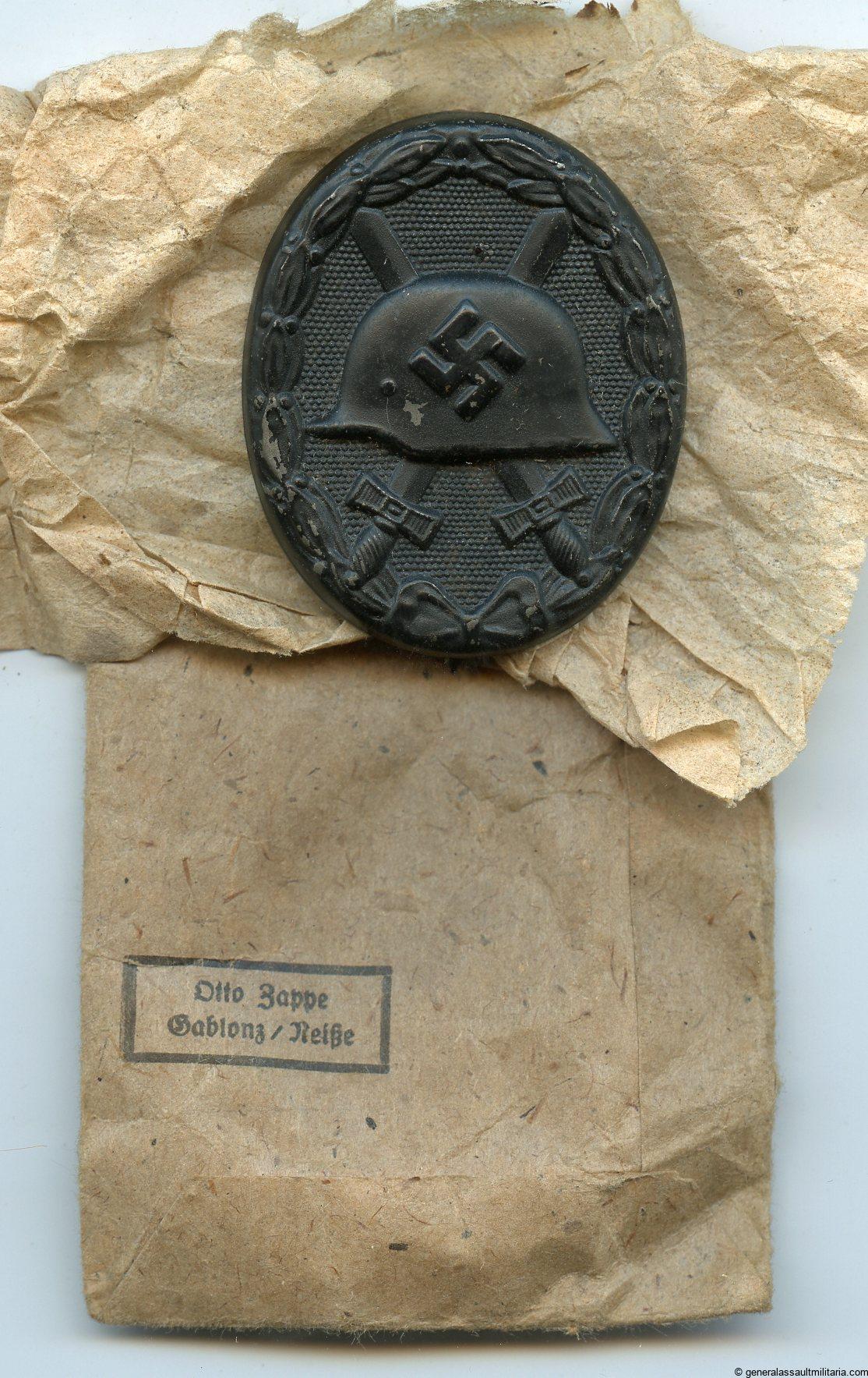 Wound badge in black set + Otto Zappe, Gablonz. Zinc construction mid to late war wound badge with 110 PkZ mark on the back of the helmet for Otto Zappe. Wound badge has some slight loss of paint, most likely due to storage as the badge shows no signs of wear. Packet remains in near mint condition with the flap in tact and no damage. More uncommon set with matching packet and paper.
