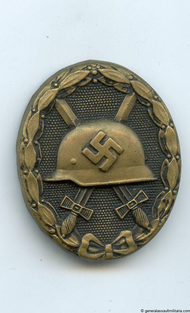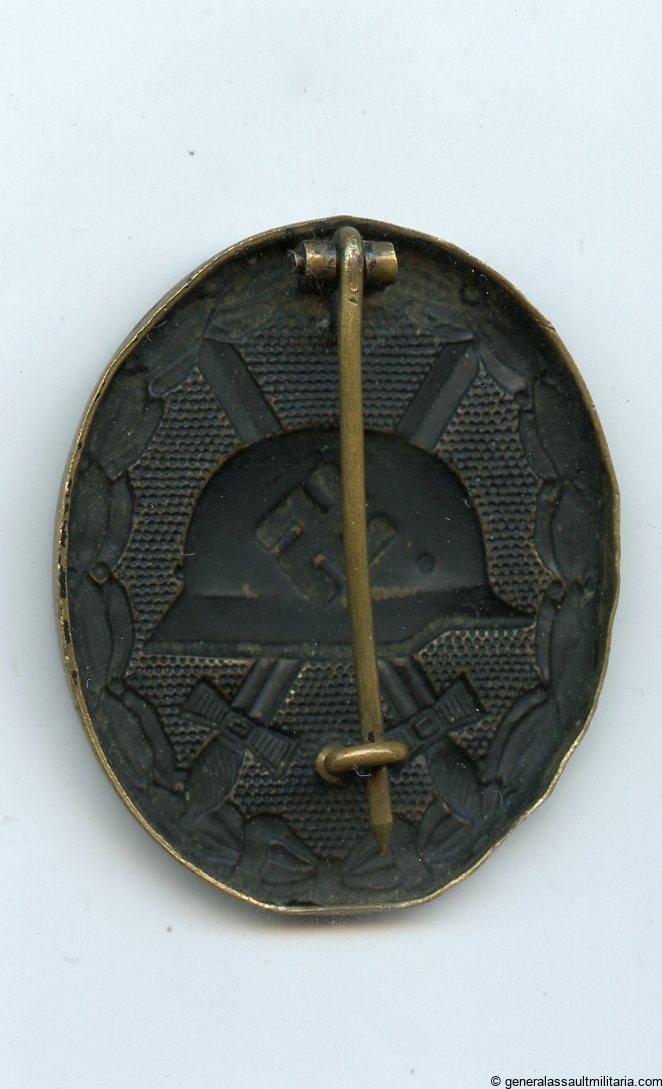 Wound badge in black – Unknown maker. Well worn and cleaned tombac wound badge with nearly no paint remaining on the front. Good quality early badge with still a good look to it.