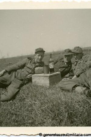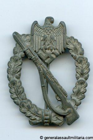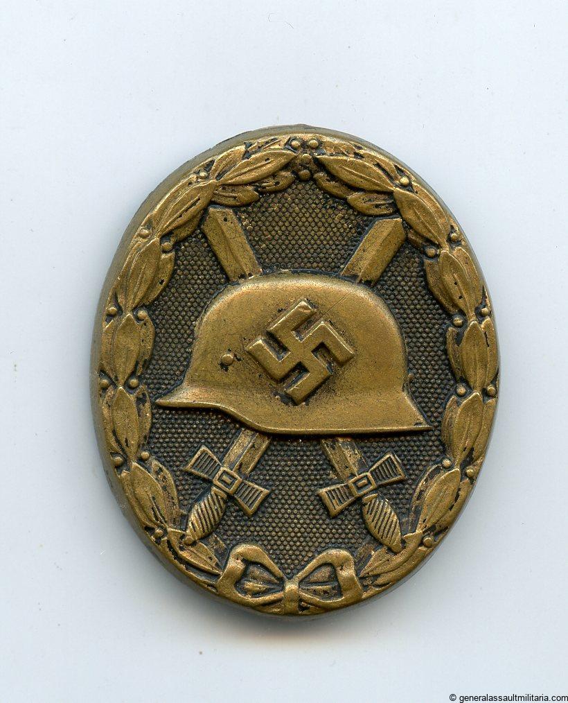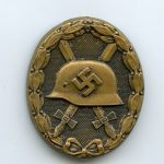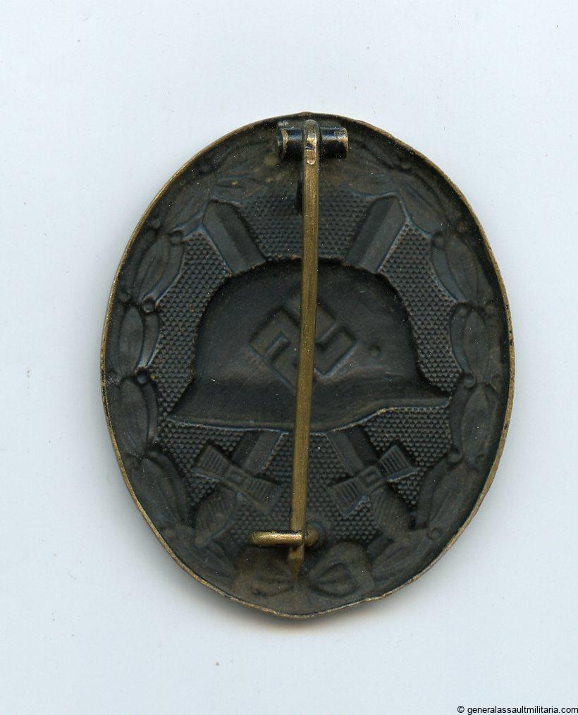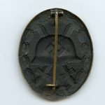 Wound badge in black – Unknown maker. Early hollow tombac wound badge with directly soldered ? shape catch and block hinge. Well worn condition and slightly bend inwards. Some paint remaining but for sure a wound badge that saw some action
