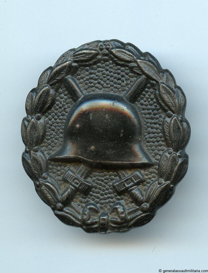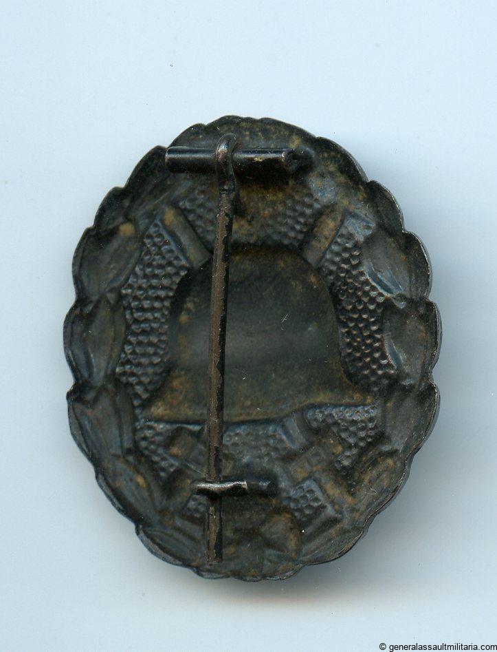 Wound badge in black WW1 – Unknown maker. Hollow steel construction with wide hinge and semi-gloss finish. Remains in unworn condition and has near prefect black finish remaining. Ver well preserved world war I wound badge.
