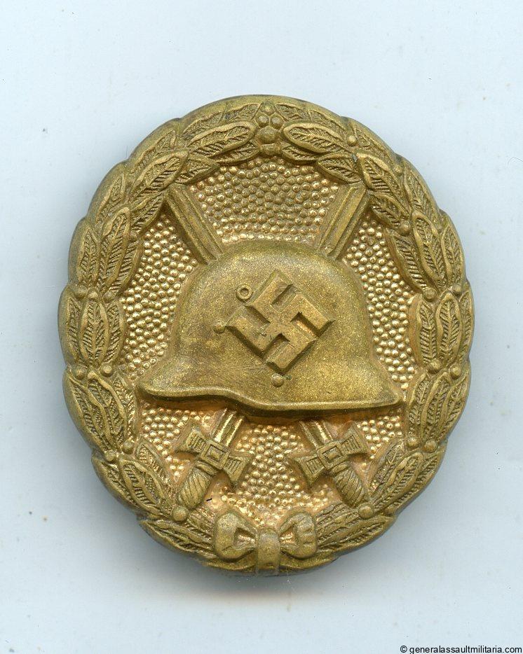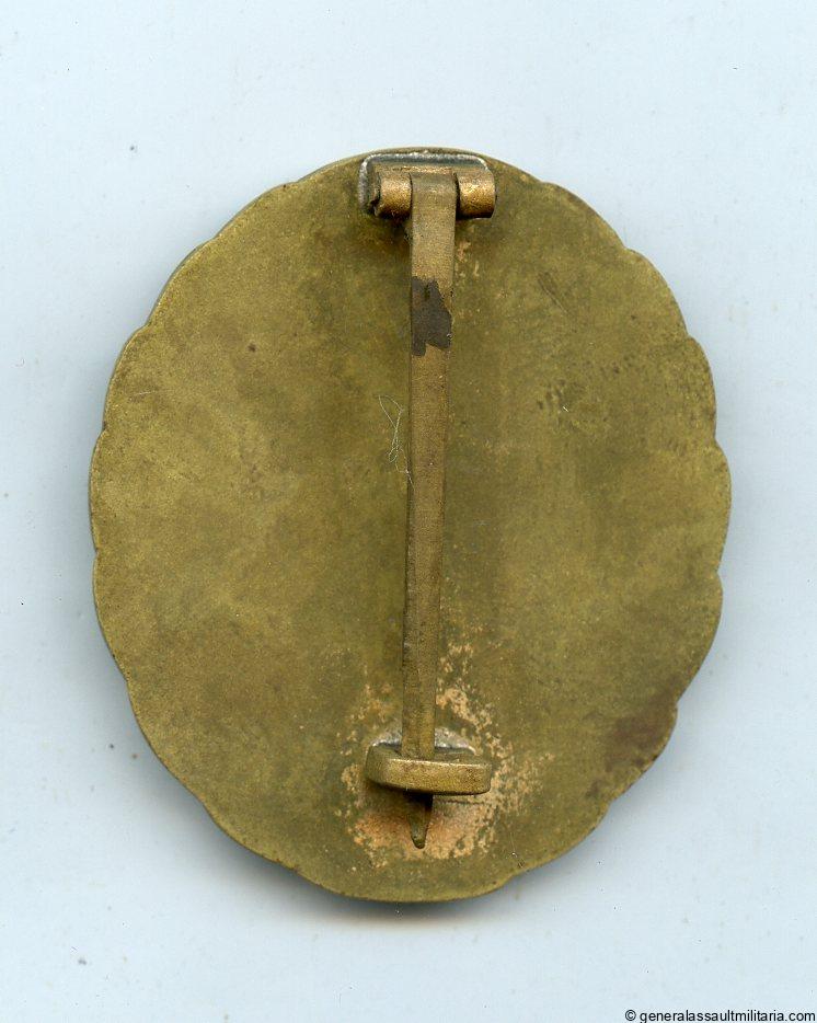 Wound badge in gold 1st pattern – Gustav Brehmer, Markneukrichen. Early pre war ‘Hohlverbödet’ tombac wound badge with 1st pattern design and typical 1939 Brehmer setup. Remains in worn condition and has nearly all the gilding missing/worn down. Rare and sought after variant, that has become very difficult to find.
