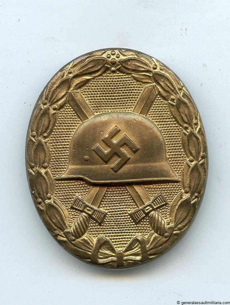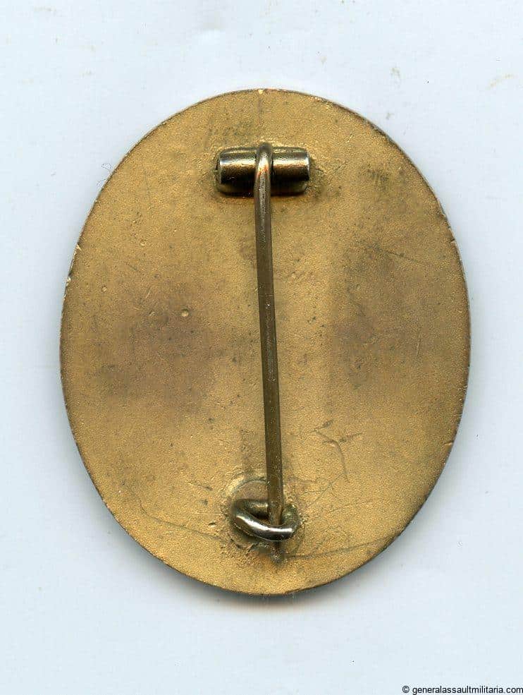 Wound badge in gold – Deschler & Sohn, München. Early tombac wound badge with gold finish and Übergrosse design. Remains in nicely worn condition with some of the gold finish worn down on the front. Shows a dark red patina on the tombac giving it good contrast. Rare gold version with good wear that is not so often offered for sale.