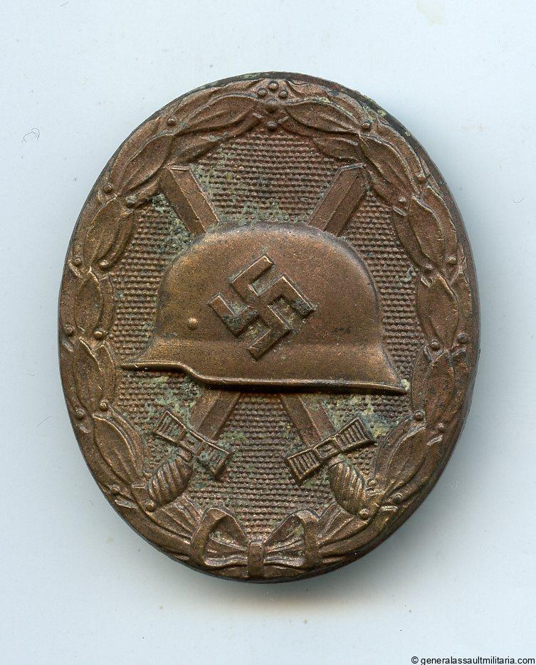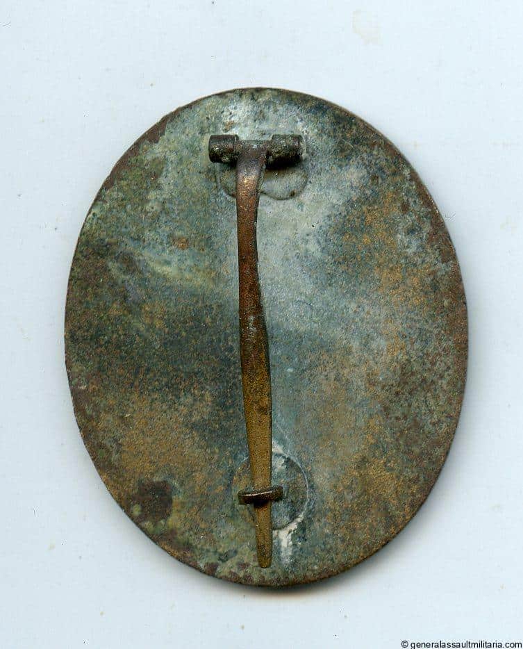 Wound badge in gold – Deschler/Wiedmann ‘Übergrosse’. Early war tombac wound badge with Deschler/Wiedmann design and typical Wiedmann setup. Remains in salty condition with nearly all the finish missing and a oxidized surface. Was most likely stored very poorly and only retains some of the finish on the reverse and setup. None the less a uncommon and sought after variant.