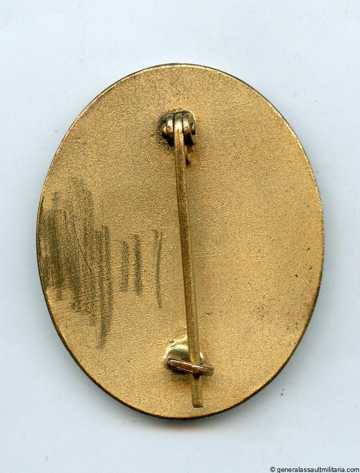 Wound badge in gold – Förster & Barth, Pforzheim. Early war tombac wound badge with gilded F&B finish and L/21 style setup. Remains in unworn condition with all the finish still present on the front and a sort of surface mark on the back. Features the F&B short setup without the guiding lines that are present on the Haupmünzamt examples, also the finish is slightly different. Very uncommon gold wound badge.