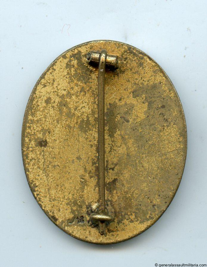 Wound badge in gold – L/13 Paul Meybauer, Berlin. Early to mid war solid tombac wound badge with L/13 makers mark. Remains in very well worn condition with nearly all the gold finish worn down on the front. Still shows some good finish remaining at the back and has a variant Meybauer setup and LDO mark. Very uncommon gold variant.
