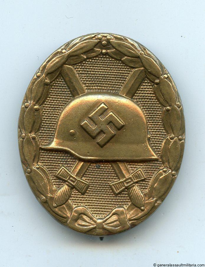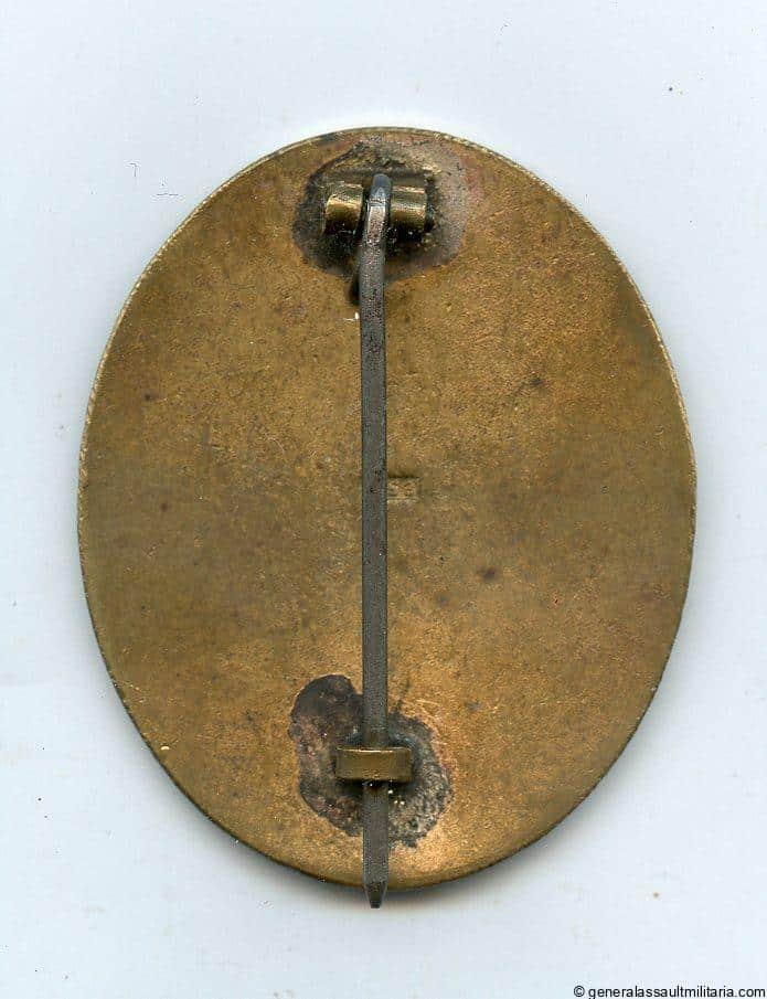 Wound badge in gold – L/53 Hymmen & Co, Lüdenscheid. Early solid tombac wound badge with L/53 makers mark, steel pin and gilded finish. Remains in well worn condition with a good part of the gold missing on the front and the base material expose. The back shows most of the finish and faded finish on the soldered area, which not uncommon for L/53 WB. Very uncommon variant that does not come up for sale often.