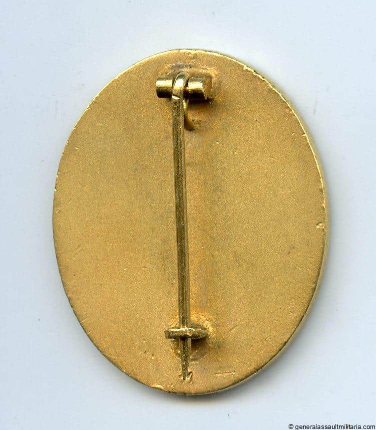 Wound badge in gold – MM11 Wilhelm Deumer, Lüdenscheid. Tombac wound badge with gilded finish and (L/)11 makers mark. Very uncommon wound badge with the Deumer 11 mark also found on their Ek1s. Remains in good condition with some good wear to the front and still excellent finish remaining on the reverse. Very uncommon and sought after Deumer variant.