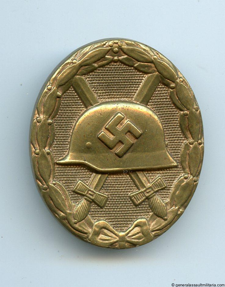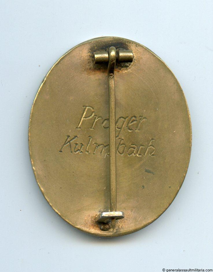 Wound badge in gold – Otto Schickle, Pforzheim. Early tombac wound badge with gold finish and design design + setup. Remain in well worn condition and shows mot of the gold finish missing. But makes up for that with the hand engraved name Prager Kulmbach on the back of the badge. Very well executed hand engraving with an name that has not been further researched so far. Interesting personalized Schickle example.