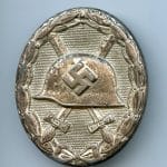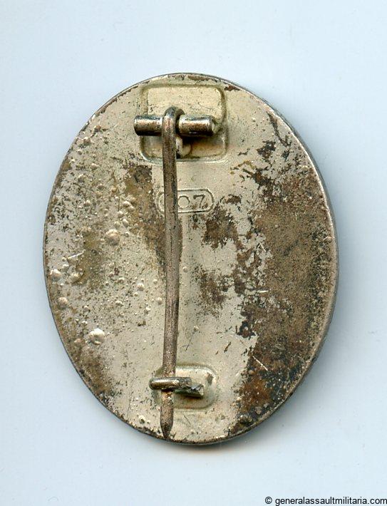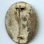 Wound badge in silver – Carl Wild, Hamburg. Late war zinc VWA with tombac coating and silver frosted finish on top. Remains in very good condition with some of the coating exposed and a light patina in some areas. Lightly wear pattern on the front with a appealing look. Maker marked 107 for Carl Wild on the back.