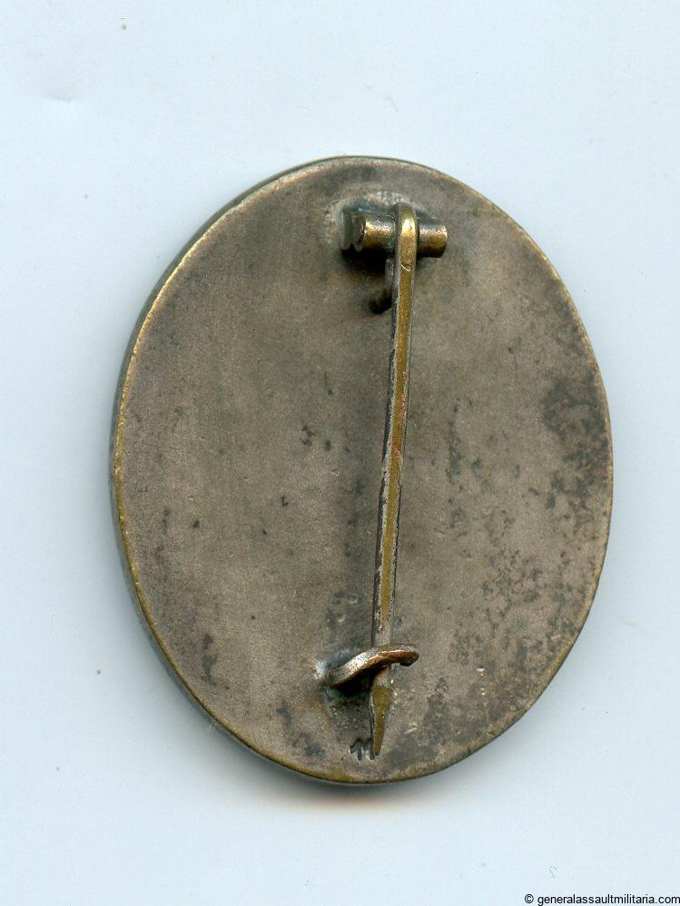 Wound badge in silver – Grossmann & Co, Wien. Early to mid war solid tombac VWA with 11 PkZ mark under the catch. Remains in worn condition with a good part of the silver plating worn down on the front. Slightly more uncommon marked wound badge.