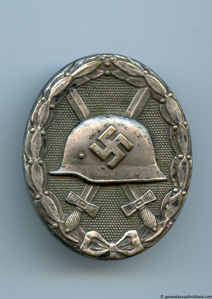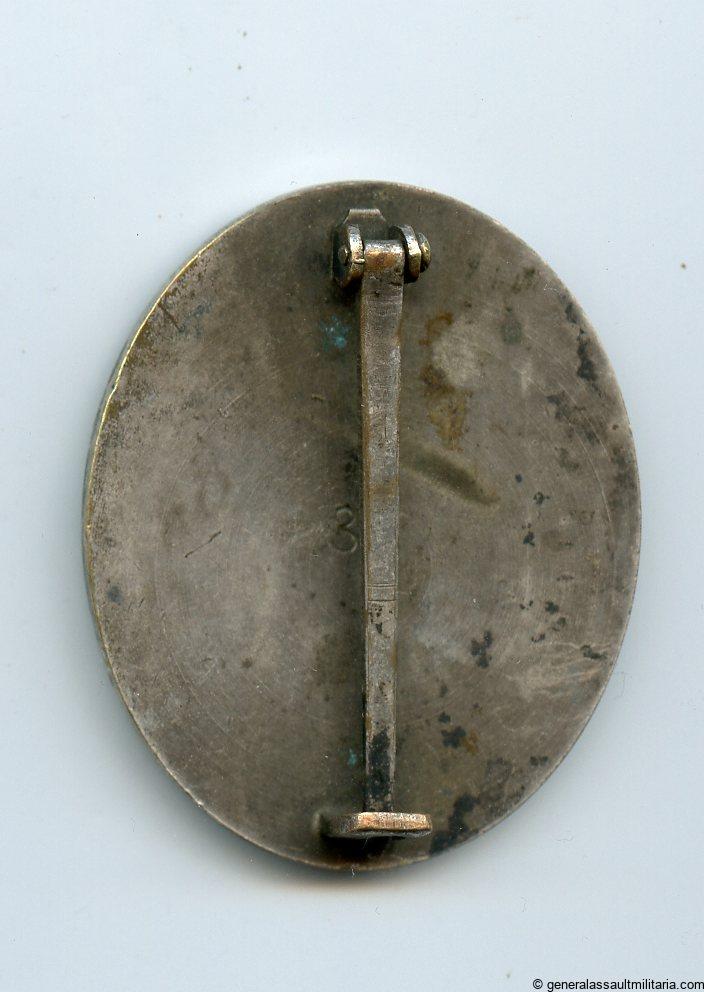 Wound badge in silver – Hauptmünzamt, Wien. Early to mid war solid tombac badge with silver plated finish. Lightly worn condition with nearly all the silver plating still present on the badge. Wide pin(tapered version) setup variant with Hauptmünzamt PkZ 30 mark on the back.