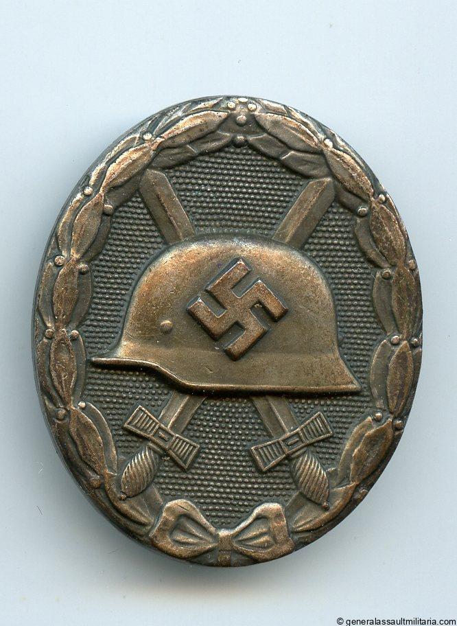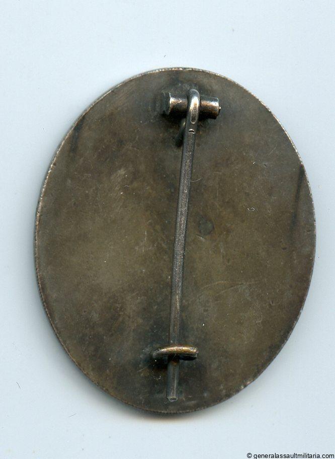 Wound badge in silver – MM L/13 Paul Meybauer, Berlin. Early solid tombac wound badge with silver plated finish and L/13 maker mark under the catch. Remains in lightly worn condition with some of the silver plating worn down and the base material exposed. Has a light patina over the silver plating giving it a good dark contrast with the exposed tombac. Uncommon early Paul Meybauer LDO variant.