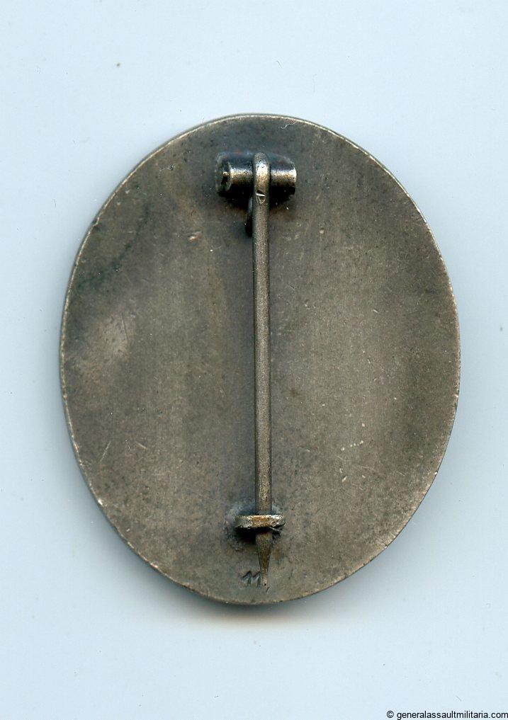 Wound badge in silver – MM11 Grossmann & Co, Wien. Tombac wound badge with silver plated finish. Remains in lightly worn condition and shows some of the tombac coming through. Referred to as the Grossmann version with the MM11 under the catch. Very well preserved wound badge.