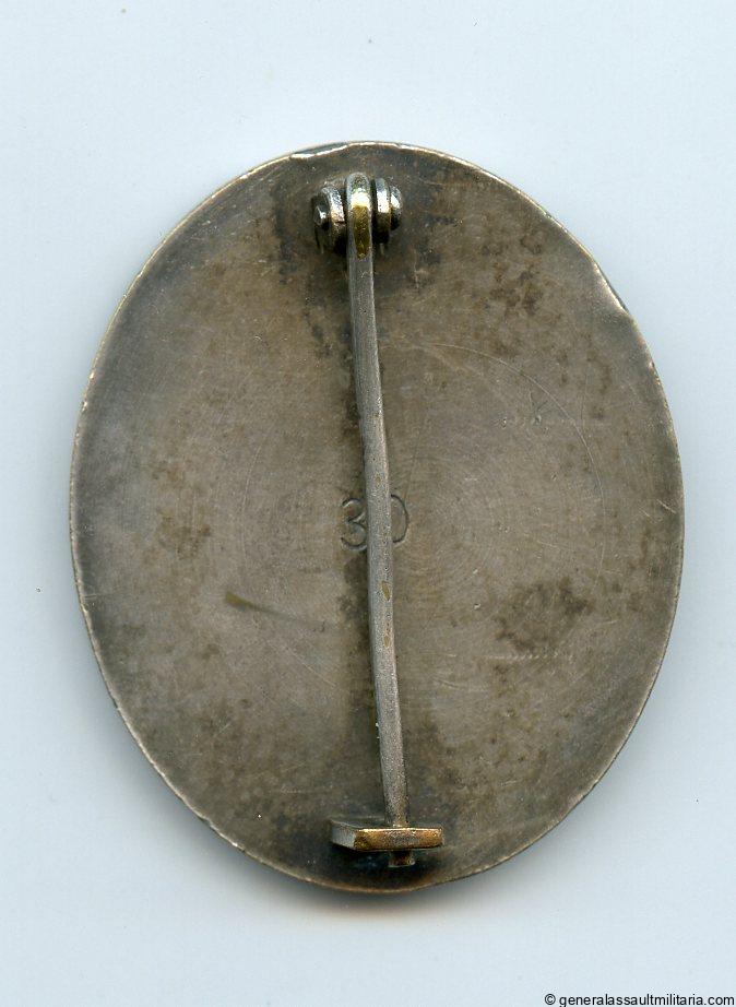 Wound badge in silver – MM30 Hauptmünzamt, Wien. Early war unmarked solid tombac wound badge with Hauptmünzamt design and setup. Remains in good worn condition with some of the thick silver plating worn down. Nicely maker marked 30 on the reverse.