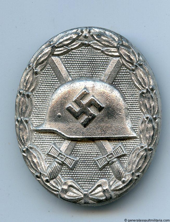 Wound badge in silver – MM92 Josef Rückert & Söhne, Gablonz. Zinc wound badge with silver plated finish in unworn condition. Nicely marked marked with the textbook off center 92 makers mark voor JR&S. Fine silver wound badge example a by a more uncommon maker in top condition.