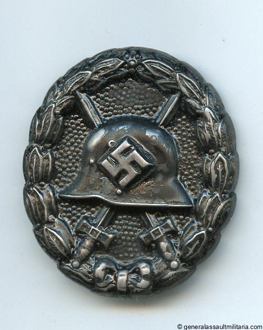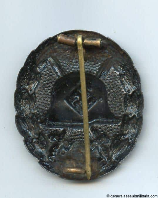 Wound in black 1st pattern – unknown maker. Hollow steel construction 1st pattern wound badge with glossy black finish. Remains in well worn condition with some of the base material exposed but no signs of rust on the front. The back shows a well worn brass setup and only has some light old rust near the setup. Front was IMO cleaned lightly. Good look wound badge with lots of finish remaining.